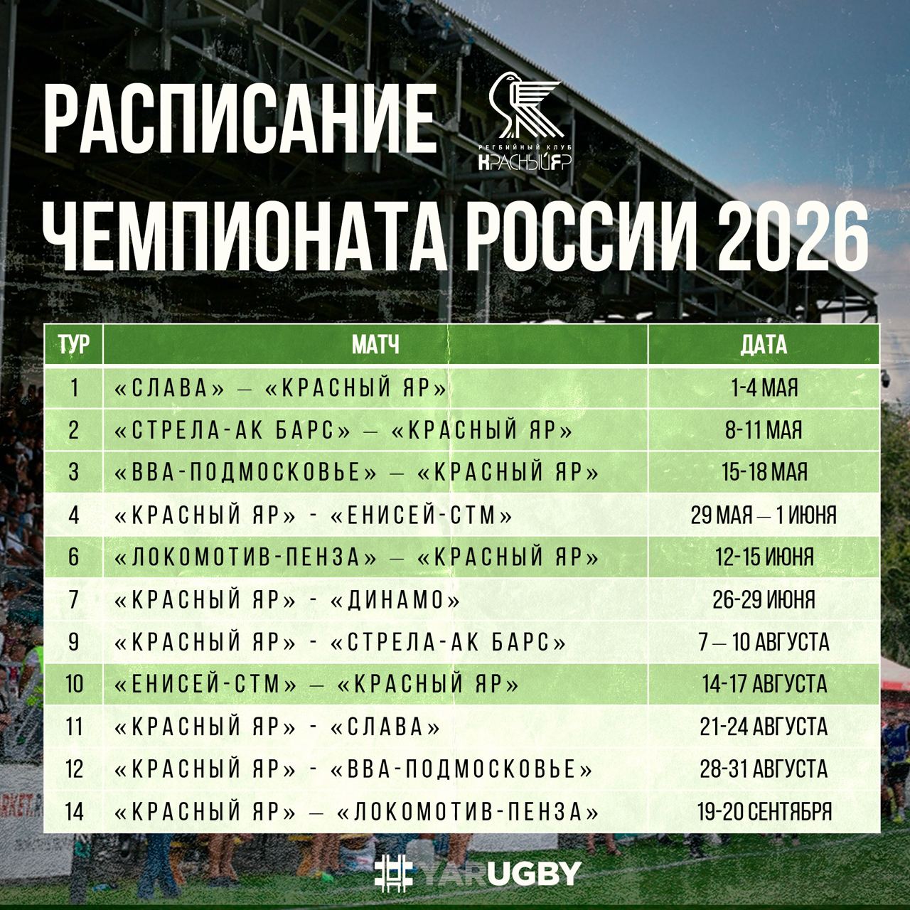 «Красный Яр» в первых трёх турах сыграет в гостях – в Москве, Казани и Монино. Только в 4 туре болельщики «КЯ» увидят команду воочию на родном стадионе в дерби с «Енисеем-СТМ», где на кону будут не только очки чемпионата, но и Кубок Николаева. Трудный календарь на старте.